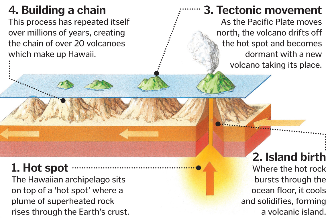The Earth’s crust is split into gigantic pieces called tectonic plates. These plates are in constant motion, propelled by currents in the Earth’s upper mantle. Hot, less-dense rock rises before cooling and sinking, giving rise to circular convection currents which act like giant conveyor belts, slowly shifting the tectonic plates above them. Hawaii sits in the middle of the Pacific Plate, which is slowly drifting north-west towards the North American Plate, back to Alaska. The plates’ pace is comparable to the speed at which our fingernails grow.